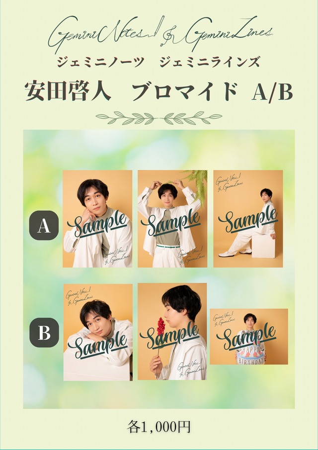 ※7日以内に入金が確認できないと無効となります。 ※2026年1月下旬頃の発送となります ★安田啓人 【内容紹介】 おぶちゃpresents 「Gemini Notes,Gemini Lines. 」 キャストブロマイド3枚組のAセット/Bセットです。 サイズ L判 89mm x 127mm 領収証は出せません。 配送に時間がかかる場合がございます。 ご了承ください。